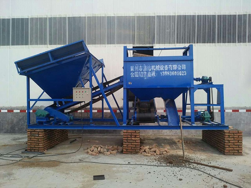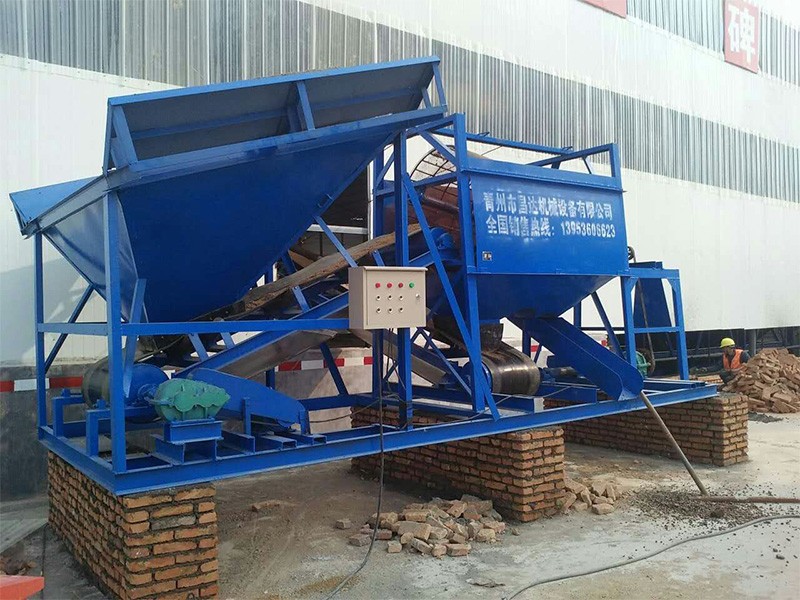 整個設備由原料儲料斗、原料供料皮帶機、平置篩網、成品砂堆料皮帶、棄石出料槽等組成,設備通電運轉后由裝載機將原料裝入大容量儲料斗,原料經由供料皮帶投入到平置篩筒,旋轉的篩筒帶動原料在筒內葉片的推擠、翻滾下形成原料在篩網面滑滾的人工篩砂效果,篩出的成品砂通過集料斗落在成品砂皮帶上,同時被皮帶提升落下呈成品料堆、或直接落入儲料斗,整個過程連續且物料分級清楚。